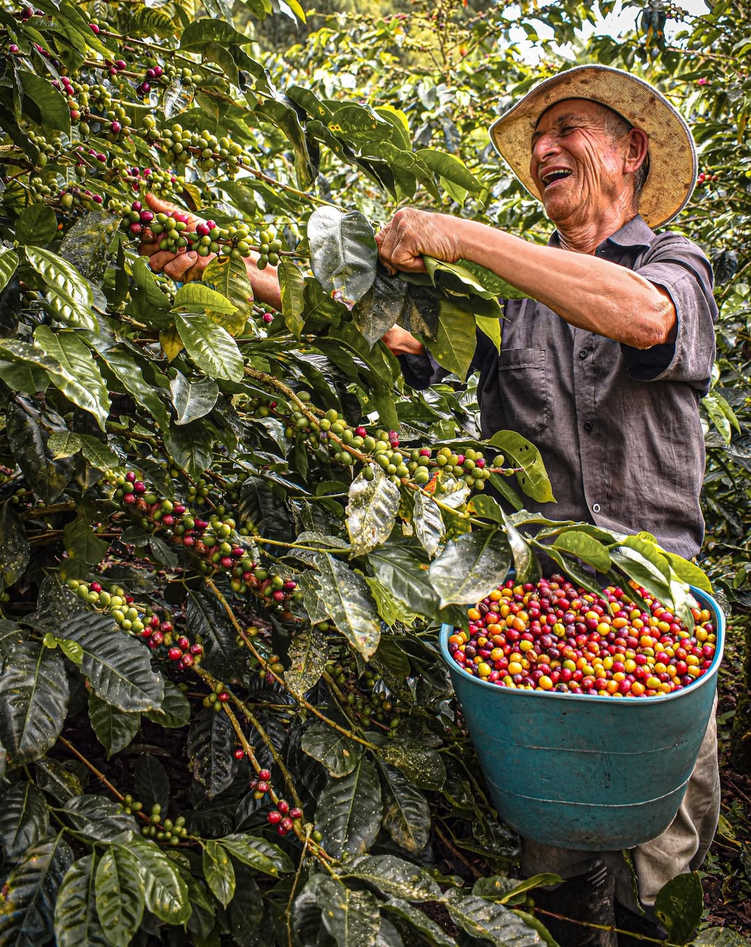 Campesino recolectando granos de Café de manera artesanal en una finca.